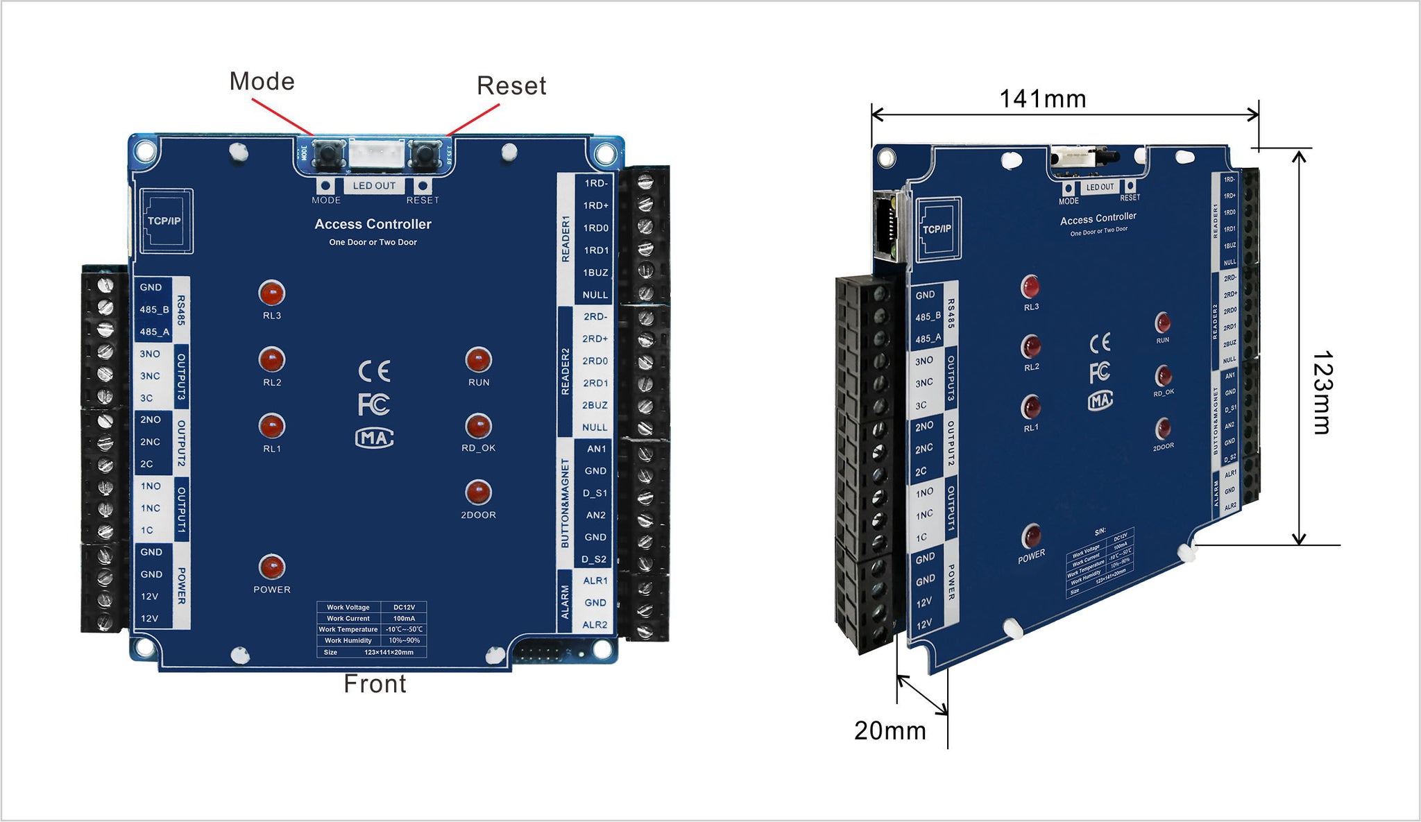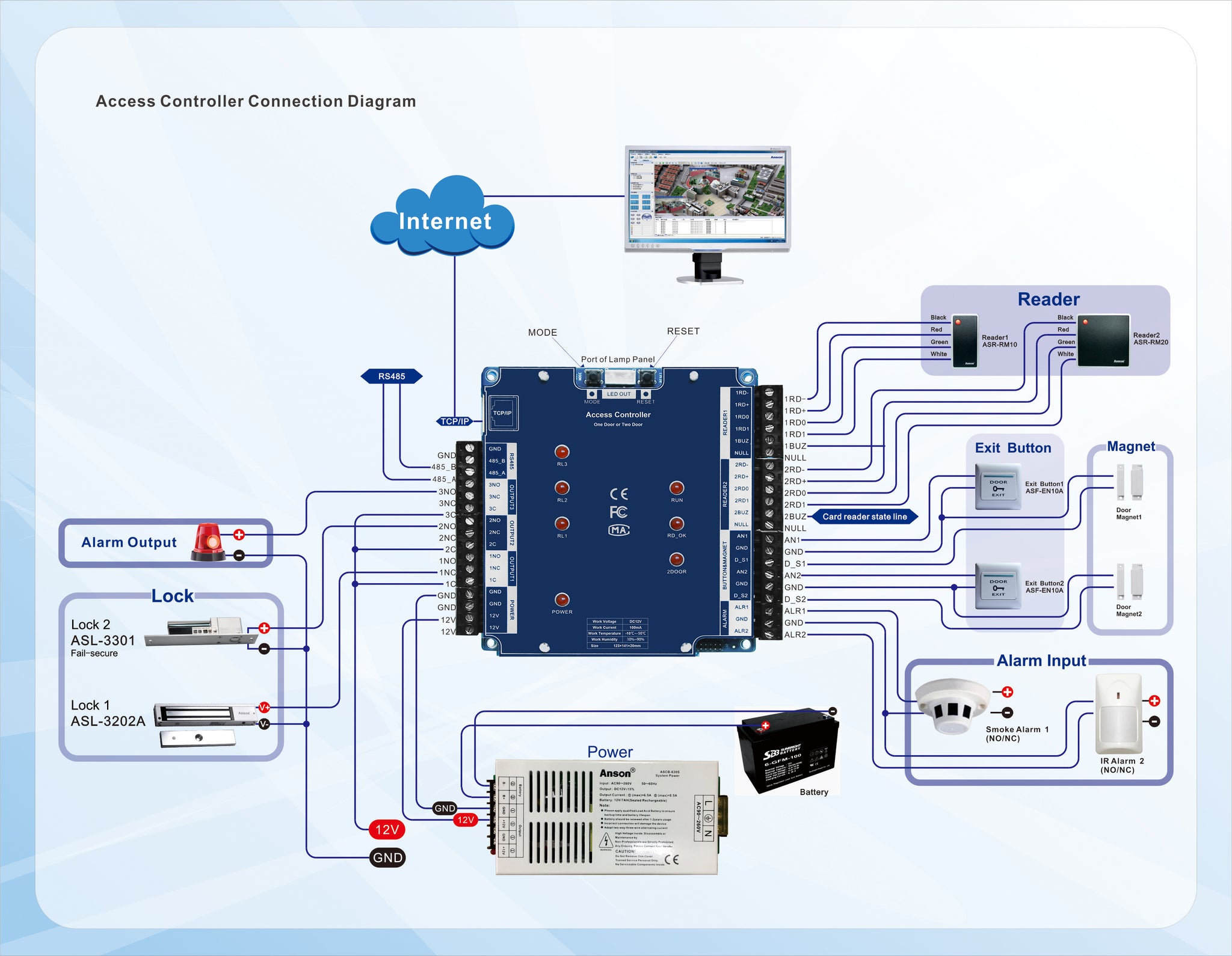 Reply: TCP / IP communication mode, Recognition mode can be Fingerprint / card. And it also includes Wiegand output, alarm input and output, door-magnet, lock, tamper, exit button and so on. Any question, please contact us freely.