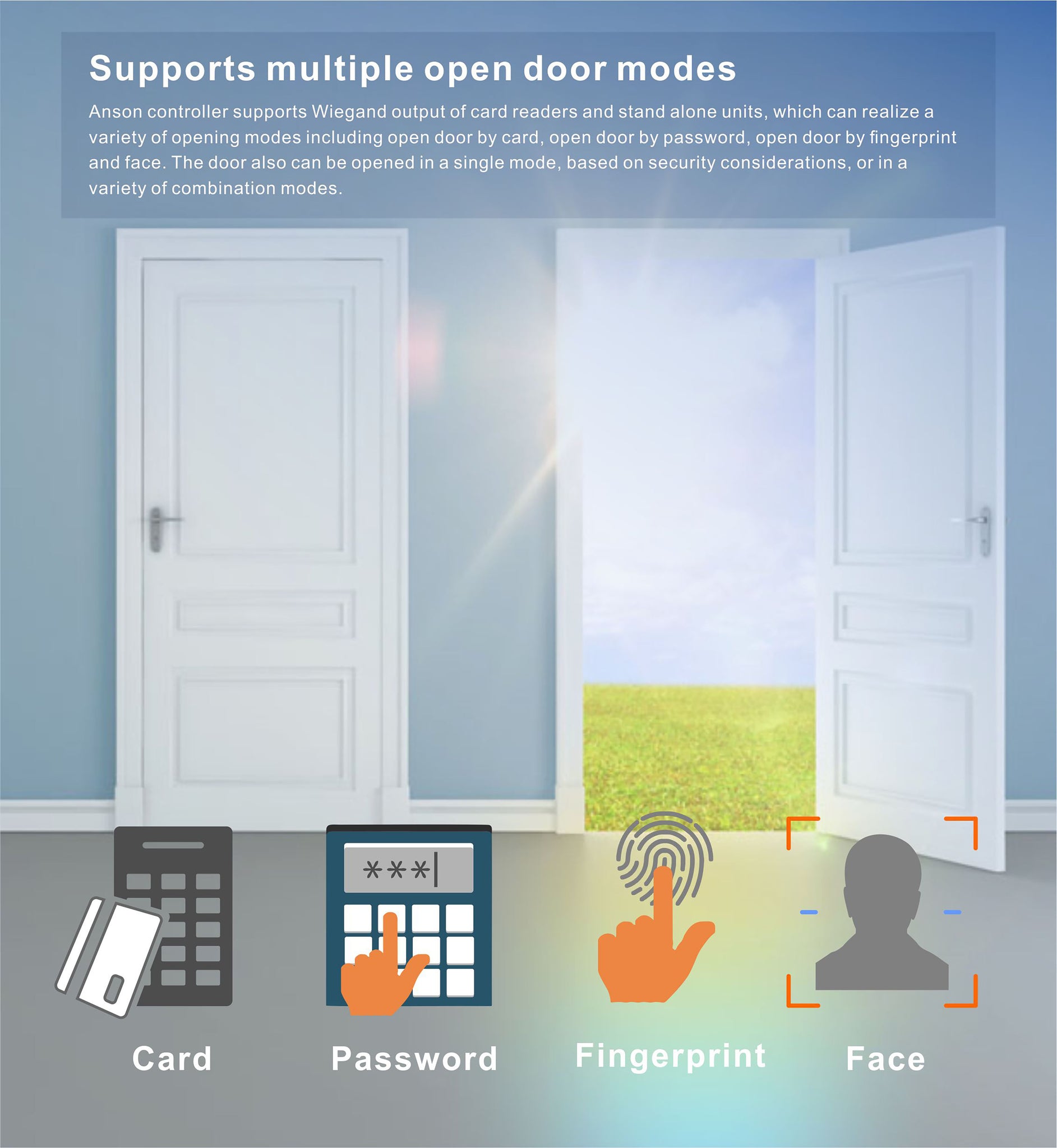 Reply: TCP / IP communication mode, Recognition mode can be Fingerprint / card. And it also includes Wiegand output, alarm input and output, door-magnet, lock, tamper, exit button and so on. Any question, please contact us freely.